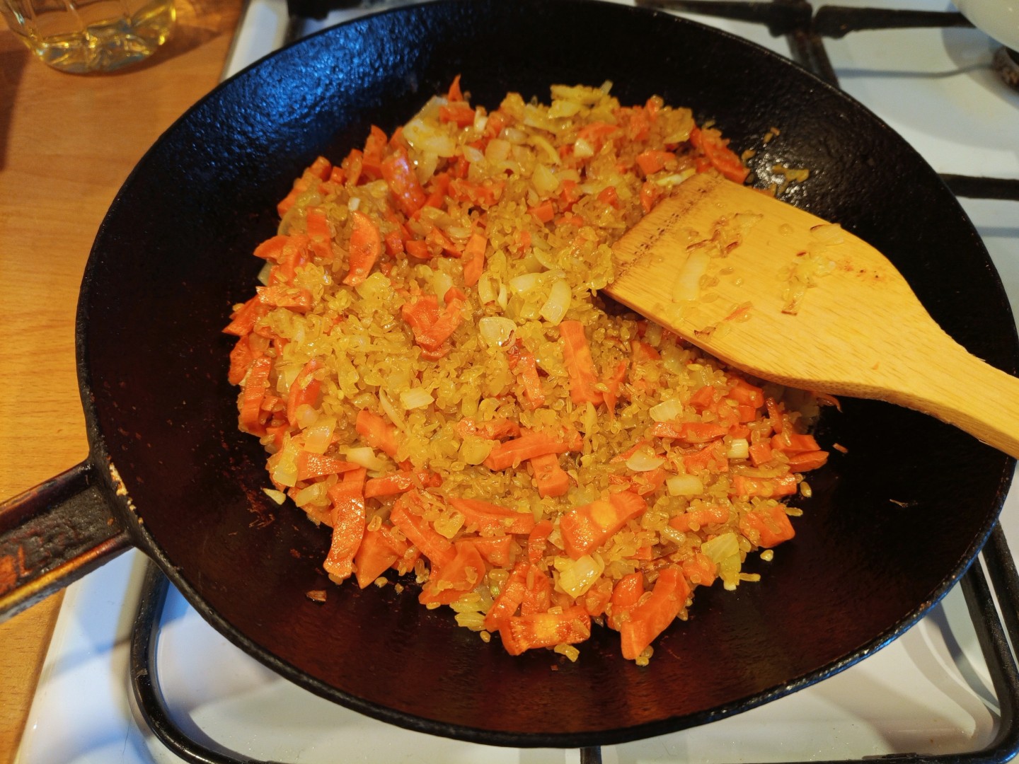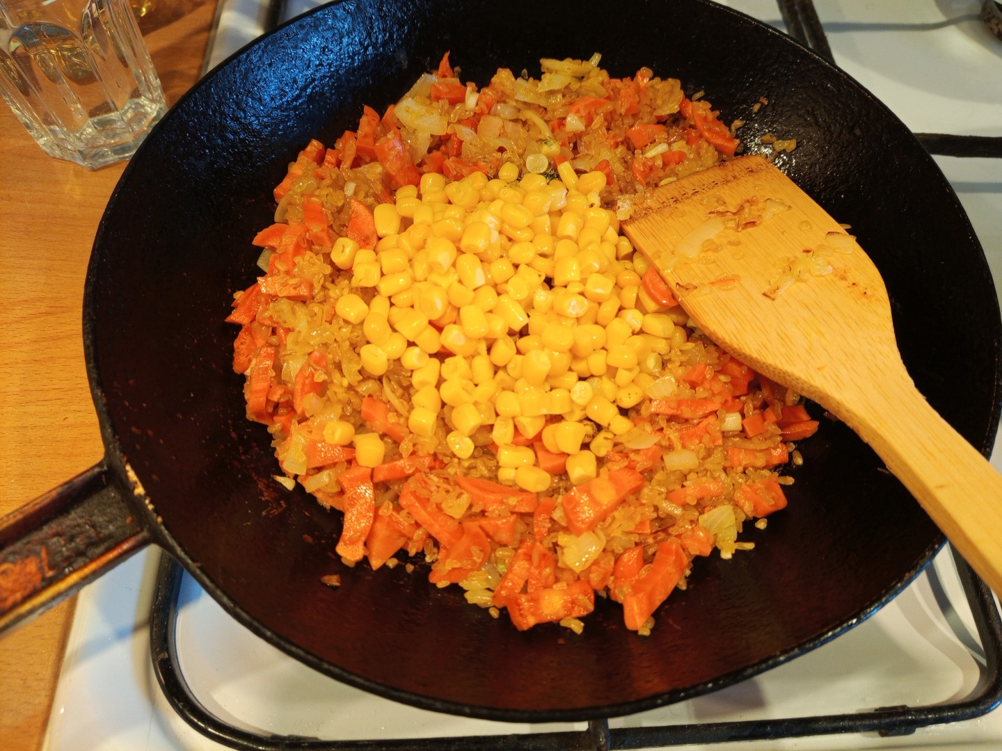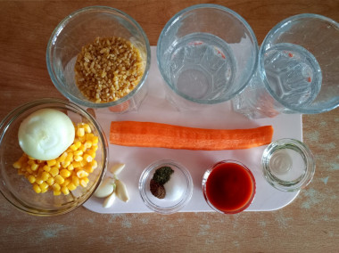 Готовила всё строго по шагам: обжарила лук с морковью, добавила булгур, дала ему немного подрумяниться, потом отправила кукурузу, чеснок, пассату, специи и воду. Тушила под крышкой около 20 минут, потом добавила еще немного воды, т.к. булгур был жестковатым, через 5 минут выключила и накрыла полотенцем, чтобы гарнир дошел.