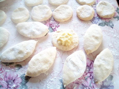 Готовое дрожжевое тесто разделите на небольшие кусочки. Из кусочка теста сделайте небольшую лепешку, в центр выложите картофельную начинку и залепите края, сформировав пирожок.