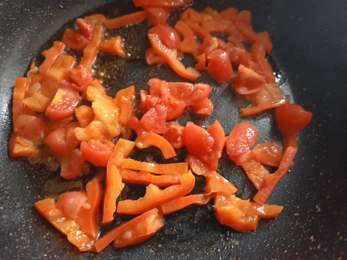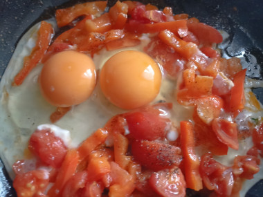 Добавьте нарезанные помидоры. Жарьте при постоянном помешивании еще 2 минуты. В конце все посолите, поперчите.Шаг 7: