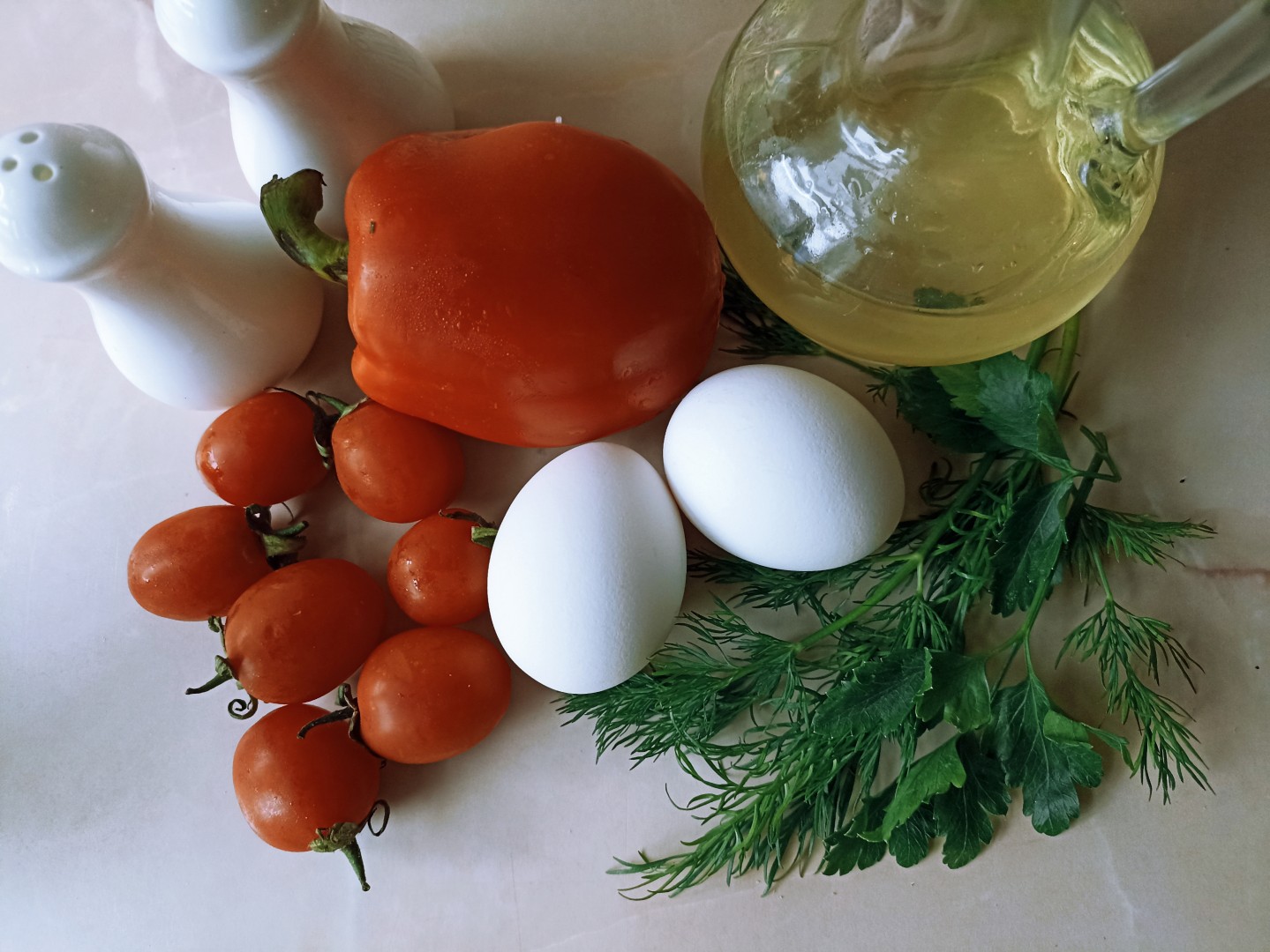 Взяла свежие продукты по списку. Помыла и порезала овощи. Обжарила овощи по описанию в рецепте. Из специй клала только соль и перец. Вбила яйца и размешала. Потомила немного и добавила свежей зелени петрушки. Аромат восхитительный!