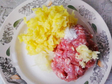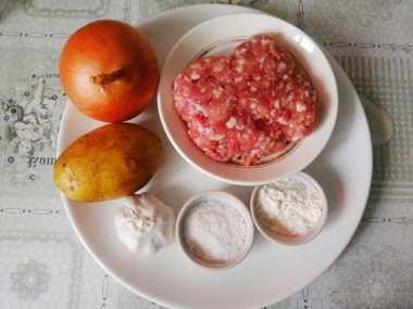 Я делала из 250 г фарша, одной средней картофелины, лука взяла немного - четверть большой луковицы, чеснока - две дольки.