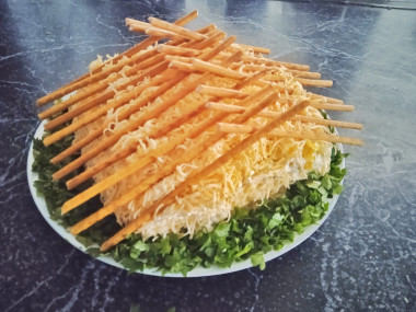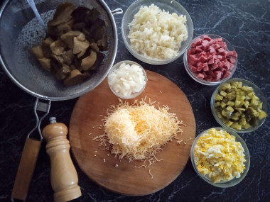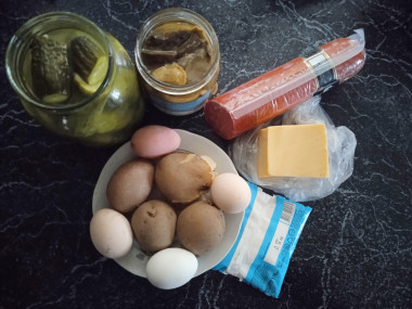 Искала рецепт салата из простых и доступных продуктов и чтоб готовка без заморочек. Мне нужно было быстро соорудить салат на праздничный стол. Взяла за основу салат с маринованными опятами и курицей, заменив только курицу на колбасу, что ускорило процесс. Колбаса у меня была сырокопченая и чуть островатая. Из грибов у меня были домашние маринованные польские грибы. Картошку и яйца я варила накануне, поэтому на варку время не тратила, когда гости на подходе. Огурцы свежие заменила на маринованные, а то уже не сезон. Лук я порезала и ошпарила, чтоб не было горечи в салате. Все продукты измельчила по описанию в рецепте, смешала, заправила майонезом, выложила квадратом на плоское блюдо. Идея моя была сделать избушку на поляне. Поэтому украшала салат по-своему. Квадрат из всех ингредиентов я обсыпала тёртым сыром, сделала крышку из соломки и вокруг салата насыпала измельчённой петрушки. Вот такая избушка на зелёной поляне у меня получилась. И довольно быстро, кстати. Салат не только украсил праздничный стол, но и удивил своим вкусом. Нежные яйца и картошка, ароматные грибочки, солёненькие огурчики, хрустящий лучок, а также пикантная колбаска, зелень - это всё вместе настолько вкусно, что сложно оторваться! Хрустящие маринованные огурчики только приятно дополнили салат, они очень гармонично сочетаются с остальными ингредиентами и дают приятного вкуса и хрусткости. Даже сыр хорошо вписался))) Великолепный рецепт! Большое спасибо автору!