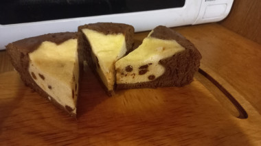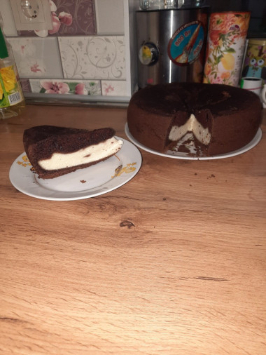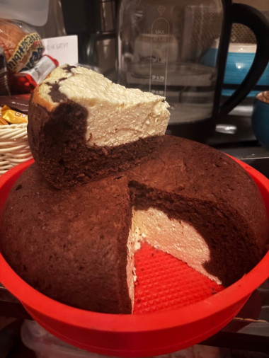 Спасибо за рецепт)У меня выглядит так,как будто тёмное тесто "обняло" творожную начинку,хотя я делала всё строго по рецепту. Видимо творожное тесто было гуще,поэтому присело в середину.Но это вкусно.Тёмное тесто немного напоминает Брауни,а творожная начинка напоминает творожную запеканку.Мне кажется если добавить цедру апельсина или лимона в творог,будет ещё вкуснее,у меня просто не было в наличии. В моей мультиварке выпекалось два раза по 60 мин. И потом не открывая крышки на подогреве 20 мин. Ещё стоял.Потом открыла и достала.Получился пышный и красивый,а главное вкусный.Запах был по всему дому от какао) Для разнообразия само то)Рекомендую данный рецепт.