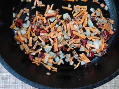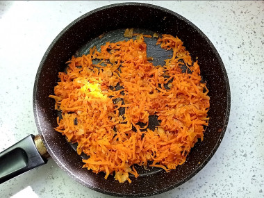 Для зажарки взяла только лук и морковь, перец дочка не любит. Кроме растительного масла добавила на сковородку кусочек сливочного. Это заметно улучшает вкус супчика.