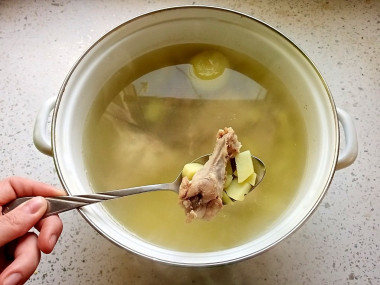 Суп я варила из куриного бедра и двух крыльев. В бульон добавила лавровый лист и луковицу, по готовности бульона убрала их. Куриный бульон процедила, он светлый и не хочется, чтобы в нем плавал свернувшийся белок. Кастрюлю помыла.