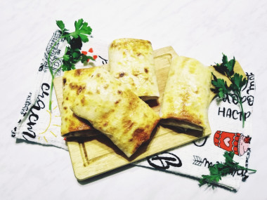 Лаваш с фаршем и сыром подавайте в теплом виде с салатами, солениями, свежими овощами. Но и наследующий день остывшие конвертики из лаваша можно разогреть в микроволновке или духовке. Их вкус от этого не пострадает. Приятного аппетита!