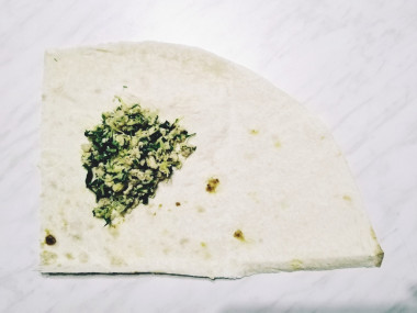 Сверните конвертиком. Для этого заверните лаваша сначала слева и справа, затем оберните два раза нижней стороной.