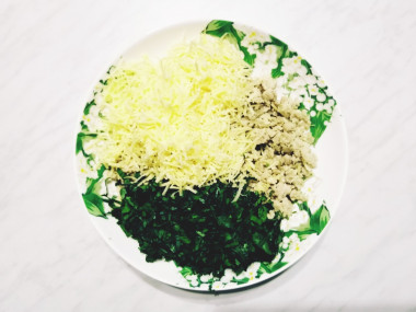 В емкость с остывшим фаршем добавьте натертый сыр, измельченную зелень.