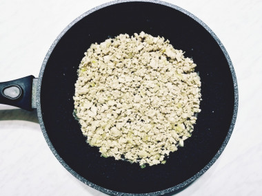 Когда лук обжарится, отправьте в сковороду мясной фарш. Перемешайте, разминая вилкой комочки. Посолите, поперчите по вкусу. Тушите примерно 15 минут под крышкой. Готовый фарш переложите на тарелку. Пока он остывает, подготовьте другие ингредиенты.