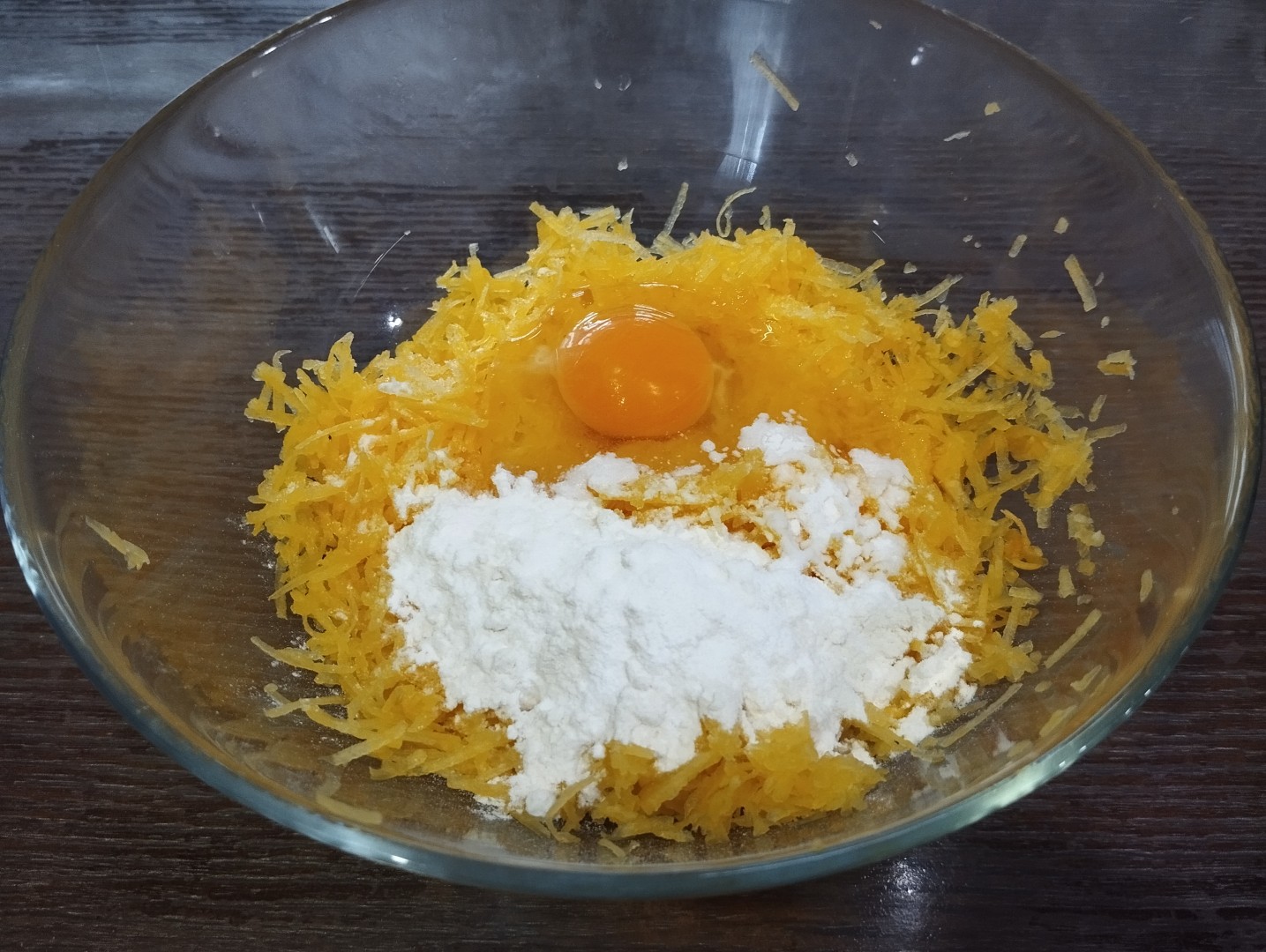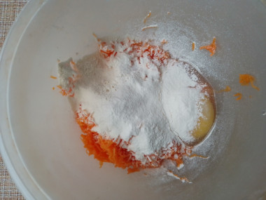 Добавьте к тыкве яйцо и соль. Просейте муку. Так как мы не добавляем ни соды, ни разрыхлителя, именно просеивание даст небольшую пышность оладьям.