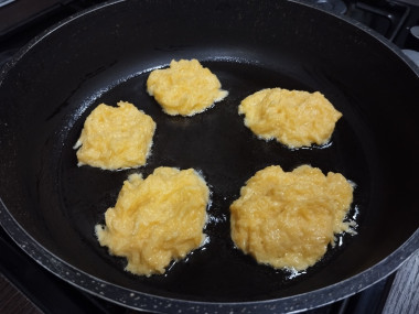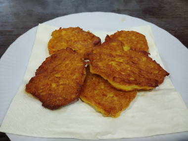Натерла для рецепта тыкву на мелкой тёрке. Так как у меня она дала довольно много сока, то муки я добавила побольше, но и сильно забивать мукой не стала. Пожарила оладушки на сковороде с маслом и выложила их на бумажное полотенце, чтобы оно впитало лишнее масло.