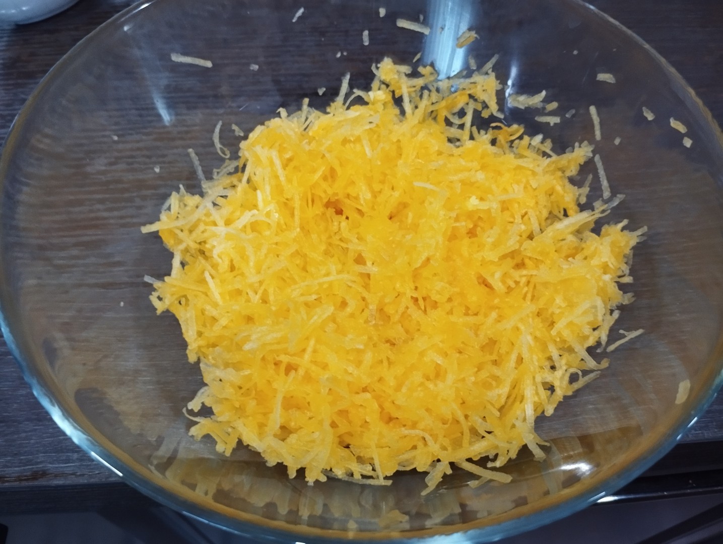 Натрите тыкву на терке. Какого размера выбрать отверстия? Решать вам. Можно использовать самую крупную, на ней натереть тыкву будет проще и быстрее всего. Но тогда оладьи придется дольше жарить, иначе тыква в них останется жесткой. Можно натереть на самой мелкой - получится практически пюре. Оладьи из него будут самые нежные, но придется потрудиться. Я всегда тру на средней. И быстро, и вкусно.