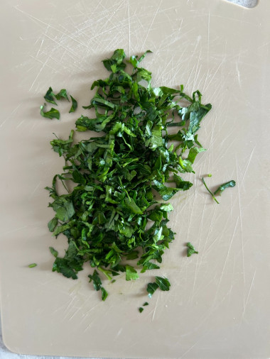 Петрушку вымойте под проточной водой и встряхните от лишней влаги. Зелень мелко нарежьте. Петрушку можно заменить на укроп или кинзу. Чтобы сливочная намазка получилась более нежной, жесткие стебли у зелени лучше удалить.