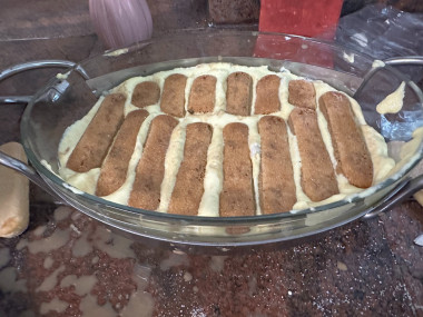 Возьмите плоскую тарелку (или форму с бортиками). Слегка смажьте дно кремом, чтобы печенье не смещалось. Добавьте в кофе алкоголь (если вы используете его) и вылейте в блюдце. Опустите в кофе палочки печенья на несколько секунд и выложите ровным слоем. Не нужно пропитывать печенье слишком сильно — по структуре оно как губка, от излишка кофе может размокнуть и потерять форму.