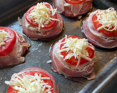 Чтобы мясные гнезда не развалились при запекании, обмотайте их вокруг беконом. Чтобы блюдо получилось более ароматным, лучше всего использовать копченый бекон. Помидоры помойте и нарежьте колечками. Разложите их в каждое гнездо.