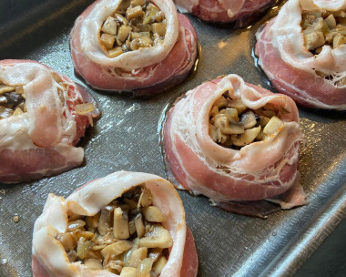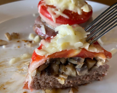 Сначала выглядит немного все сложно и хлопотно… На самом деле - все просто, быстро. И нереально вкусно! Готовила все по рецепту. Фарш в пропорции 80 гр говядины / 20 гр свиной. Копченая грудинка, помидорка, сверху сырок. Грибочки пережарила с лучком. Готовила 30 минут (200 градусов).