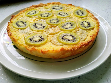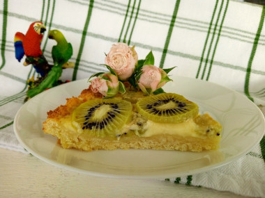 Ура! В ленте появился пирог с киви в духовке! Я просто обожаю киви, но блюд с этим экзотическим блюдом не очень то много. Салаты с киви у нас не едят, а вот сладкий пирог съели быстро) Я не часто пеку пироги с песочной основой, она у меня не всегда получается, поэтому долго настраивалась на эту выпечку. На этот раз основа хорошо пропеклась, благодаря тому, что сначала она выпекается отдельно. Все делала по инструкции, после выпечки коржа выложила кружочки киви, сверху вылила заливку и запекла. Последний слой из киви запекался 15 минут, наверное поэтому немного "полинял" зеленый цвет. Но это совсем не важно) Пирог перед подачей хорошо охладила, мне показалось, что в теплом виде заливка жидковатая. После охлаждения попробовали пирог, вся семья осталась довольна. Песочная основа хорошо пропеченная, вкусная как печенька) Заливка стала похожа на сливочно-заварной крем, очень нежный, сладкий и он значительно загустел. Киви немного кисленькие после тепловой обработки, что отлично сочетается со сладким кремом. Вкусный пирог, я довольна результатом. Спасибо!