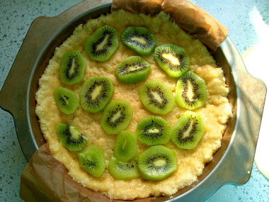 Выньте пирог из духовки и дайте постоять пару минут. Поверхность должна хорошо схватиться и выдержать вес киви. Выложите на схватившуюся поверхность оставшиеся кружочки киви. Запекайте пирог еще примерно 10 минут при 160°С.