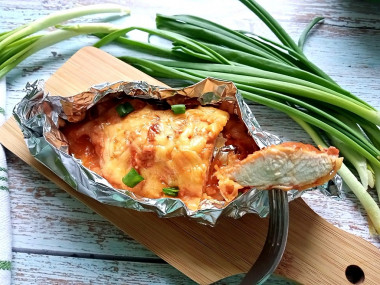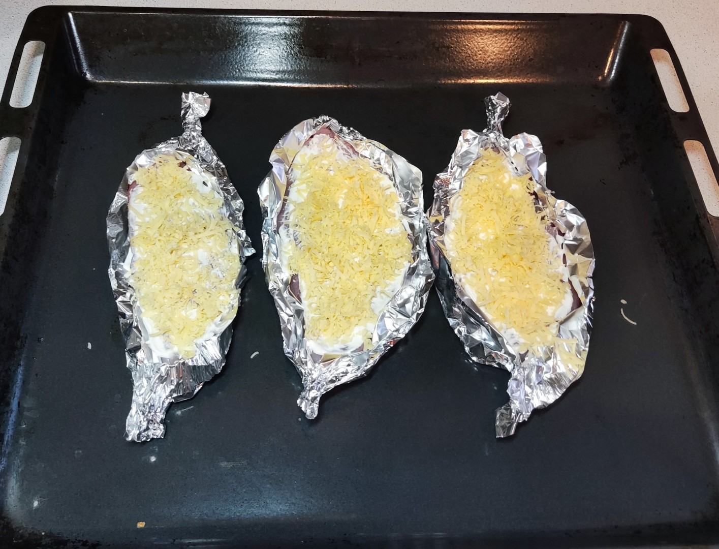 Лодочки из фольги выложите на противень и поставьте в духовку, предварительно разогретую до 200 градусов, на 25-35 минут. При запекании ориентируйтесь по своей духовке.