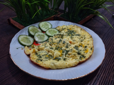 Переложите омлет на тарелку, посыпьте свежей зеленью и сразу же подайте к столу, пока горячий. Приятного аппетита!