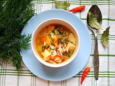 Заметила рецепт супа картофельного с курицей, такие вкусные, сочные фотографии! Тоже захотелось приготовить этот солнечный супчик для семьи. Варила его на курином бульоне, для этого использовала окорочек, мясо на нем нежное, вкусное. Разделанное готовое мясо заложила в кастрюлю в последнюю очередь, чтобы оно сильно не разварилось. Если бы варила грудку, то добавила бы сразу, ведь она жёстче. Чеснок решила добавить не в кастрюлю, а на сковородку к зажарке. Мне кажется, обжарка замечательно расскрывает пряный аромат чеснока. Суп сварился быстро и получился очень вкусным! А ещё он наваристый и сытный, для обеда отлично подходит. Зелень я добавляла непосредственно в тарелку тем, кто хотел. Рецепт отличный, спасибо!