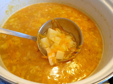 Готовую зажарку выложите в кастрюлю с супом. Добавьте чеснок, пропущенный через пресс. Добавьте по вкусу соль и специи. В качестве специи достаточно добавить немного молотого перца. Проварите все вместе 3-5 минут и снимите кастрюлю с огня.