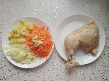 Я взяла куриное бедро, перед варкой сняла с него кожу. Бульон готовила несколько дольше - так я привыкла. Морковь нарезала небольшими кусочками.