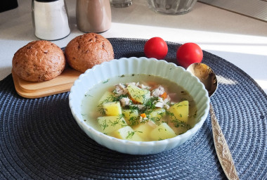 Картофельный суп с курицей готов! Разлейте его по тарелкам и подавайте к столу. Приятного аппетита!