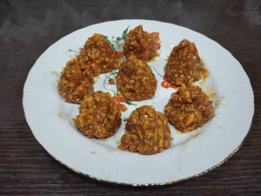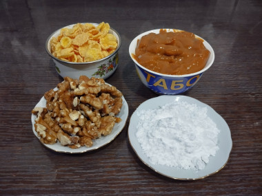 Смешала орехи, хлопья и вареное сгущённое молоко. Сформировала небольшие пирамидки руками и убрала в холодильник.