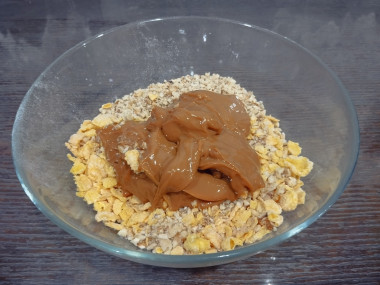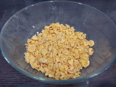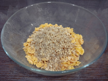 В миске соедините кукурузные хлопья и измельченные орехи. Перемешайте.