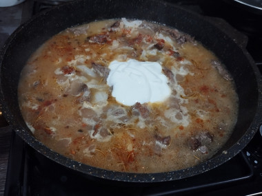 В конце тушения добавьте в сковороду сметану. Перемешайте. Прогрейте все вместе еще пару минут и снимите сковороду с огня.