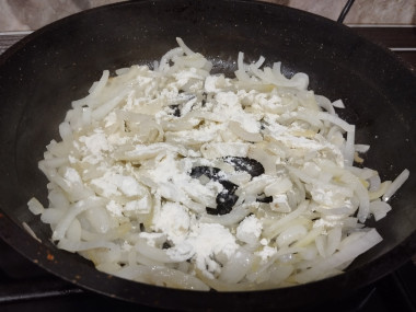 К обжаренному луку добавьте муку и перемешайте её с луком. Обжаривайте лук с мукой еще пару минут.