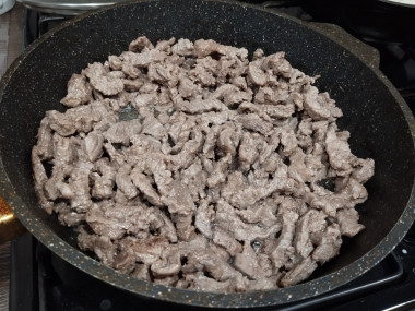 На горячей сковороде растопите немного сливочного масла и выложите нарезанное мясо. Обжаривайте его 3-5 минут, чтобы оно изменило цвет и начало немного румяниться.