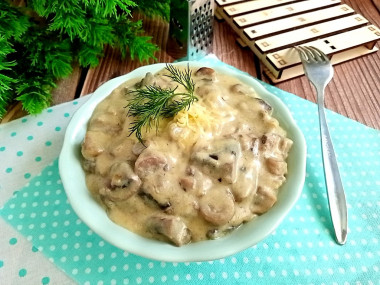 Грибы с сыром в сливочном соусе готовы! Снимите сковороду с плиты и сразу подавайте их к столу, дополнив основное блюдо! Приятного аппетита!
