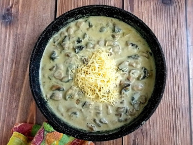 Сливочный соус не нужно варить отдельно и это очень порадовало). Сначала посыпала мукой обжаренные грибы, затем залила сливками и через несколько минут посыпала сыром. Вот и весь процесс! Очень быстро и просто.
