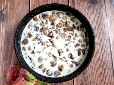 Залейте грибы теплыми сливками. Добавьте немного соли и молотого перца. Прогрейте до загустения подливы.