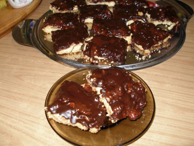 Воодушевившись фото и названием "Печенье миллионеров", решила приобщиться к кругу избранных посредством вкушения их сладостей. Поскольку в рецепте не указан размер формы, а готовый торт надо резать на квадраты, взяла свой противень 18х27 см. и замесила 1/2 порции. "Замесила" -сказано образно, т.к. тесто становиться тестом не хотело. Сплошная сыпучая смесь. Пришлось добавлять масла. Кое-как натромбовала в противень. В результате, толщина коржа получилась,как на фото. Карамельной массы сварила тоже 1/2 порции, но её хватило, только чтобы обмазать испеченный корж. А вот шоколадной массы пришлось сделать полную порцию, чтобы покрыть весь корж с карамельной массой. Нарезала на квадраты. Но при переносе их на блюдо, нижний корж рассыпался. Действуя предельно осторожно, мне удалось-таки вынуть и переместить печенье. Когда попробовала, ужасно расстроилась. Невообразимо СЛАДКО!!! Такое не спасёт ни крепкий кофе, ни чай без сахара. Хотела уже всё это выбросить, но сын остановил. В растрепанных чувствах, сокрушаясь о потерянном времени и испорченных продуктах (больше всего было жаль 2 плитки шоколада), легла спать.
