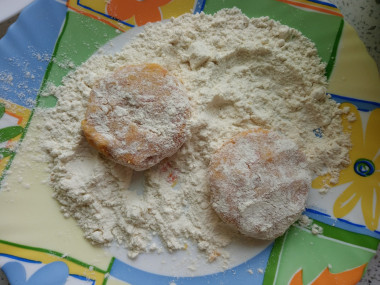Чтобы тесто меньше прилипало к рукам, формируйте котлетки влажными руками. Их можно сделать круглой или овальной формы. Запанируйте котлетки в муке с двух сторон.