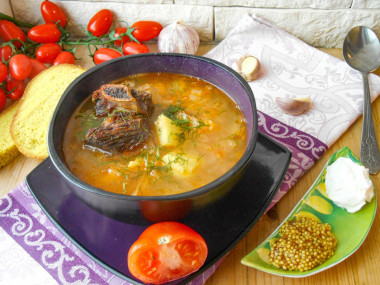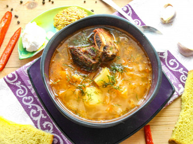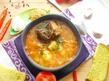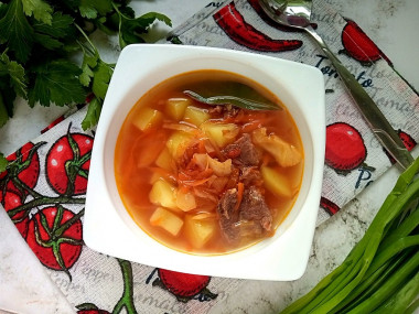 Щи из квашенной капусты это конечно очень вкусно! Бульон на говяжьей косточке получается наваристый и ароматный. Капусту я предварительно не тушила, а сразу добавила в кастрюлю с мясом. Косточки не отделяла, мои домашние очень любят именно мясо на кости. Я его извлекла из бульона и подрумянила в духовке, а потом каждому порционно выложила в тарелку. Густоту щам добавила с помощью сваренной целиком картошки. Добавила две картошки в щи, потом достала, помяла вилкой и отправила обратно в кастрюлю. Спасибо автору за рецепт!
