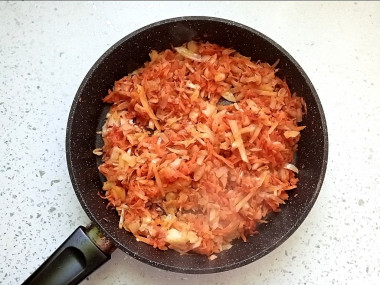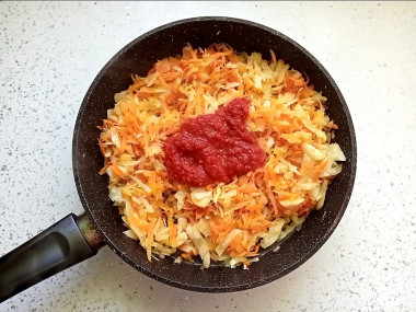 В сковороде на небольшом огне разогрейте половину сливочного масла. Выложите квашеную капусту, 1 ст. л. томатной пасты и тмин. Перемешайте.