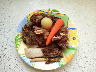 Готовое мясо выньте из бульона, отделите от костей и нарежьте кусочками.