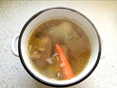 В большую кастрюлю выложите мясо, очищенную луковицу и одну морковь. Влейте чистую воду. Поставьте кастрюлю на сильный огонь, доведите воду до кипения и варите на среднем огне, снимая пену, 1.5 часа. Если есть возможность добавить корень петрушки или сельдерея, бульон получится еще ароматнее.