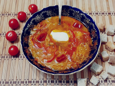 Мои любимые щи из капусты без мяса, сварила сезонный вариант. Томатный соус заменила на свежие помидоры, добавила сладкий перец и все это положила в поджарку к луку и моркови. Капусту нашинковала на терке с одним лезвием. Замороженный свежий укроп варила вместе с капустой. И как любитель специй и приправ, добавила универсальную смесь. Получился отличный лёгкий суп.
