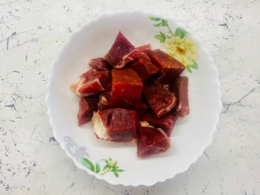 Мясо вымойте, обсушите и нарежьте небольшими кусочками. Мясо требуется без костей, только мякоть.