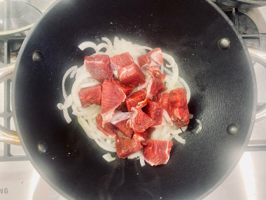 Добавьте в казан мясо и обжарить, помешивая, до румяной корочки. В конце всыпьте зиру, хмели-сунели, соль и перец и перемешайте.