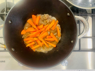 Всыпьте нарезанную морковь и жарьте помешивая, пока не выпарится лишняя влага.