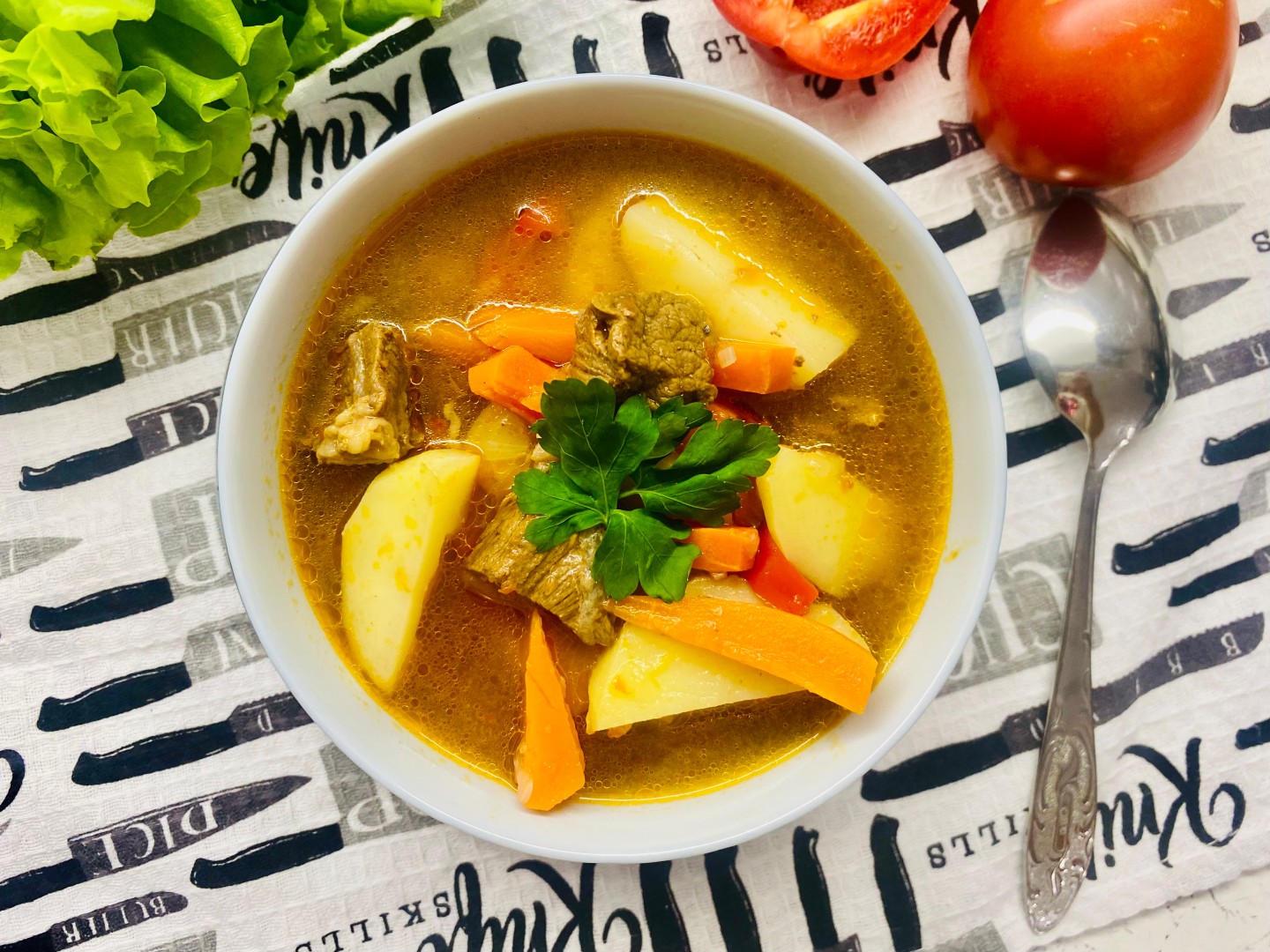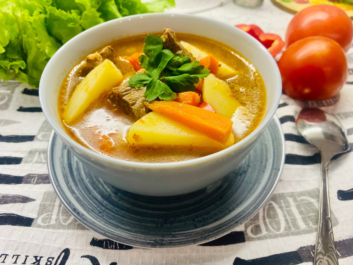 Приготовила шурпу из говядины по узбекски. Получился вкусный, наваристый, ароматный суп.