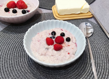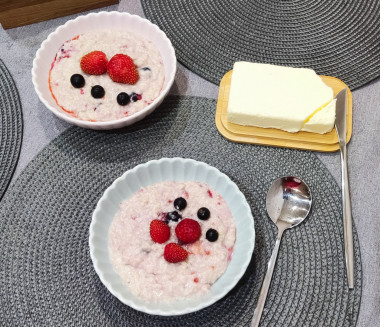 Очень интересный способ сварить привычную овсянку! Для Овсяной каши с ягодами на молоке я взяла хлопья быстрого приготовления, мне нравится нежная консистенция, которую они дают. Порцию увеличила в два раза, нам этого количества хватило на трёх человек. Ягоды взяла тоже замороженные, правда у меня была черная смородина. Ягоды добавила сразу, ведь каша варится очень быстро. Сливочное масло добавила непосредственно в тарелку, оно придало каше приятный сливочный вкус. Черная смородина добавила немного кислинки, но в сочетании с сахаром вышло очень даже гармонично) Вообще мне понравился вкус ягодной каши, оригинально) Думаю с клубникой и малиной будет даже вкуснее и ароматные, буду ждать сезон ягод. Решила мужу тоже приготовить такую кашу, только без молока. Спасибо за рецепт!