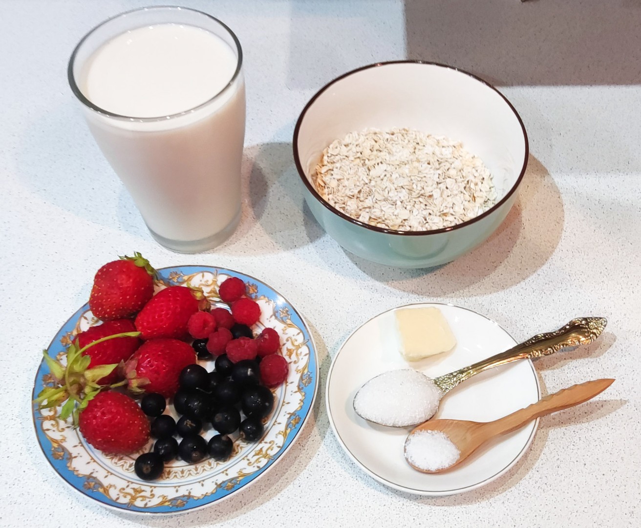 Подготовьте продукты. Хлопья возьмите любые - подойдут и моментальной, и долгой варки. Это зависит от ваших предпочтений, я взяла со временем варки 5 минут. Жирность молока может быть любая. Главное, чтобы молоко было вкусное и натуральное. Ягоды подойдут как свежие, так и замороженные - их можете предварительно не размораживать. Их набор также может быть любым.