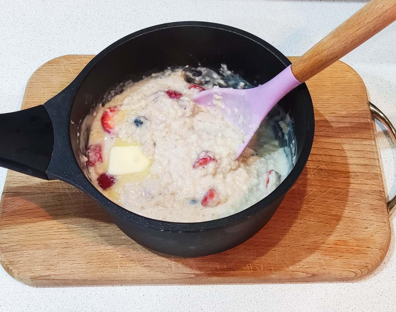 Если у вас замороженные ягоды, то всыпьте их в кашу через пару минут варки. Если свежие - то в самом конце. Я взяла клубнику, малину и ежевику, а вообще подойдут любые, без косточек. Если ягоды сами по себе кислые, то увеличьте количество сахара.